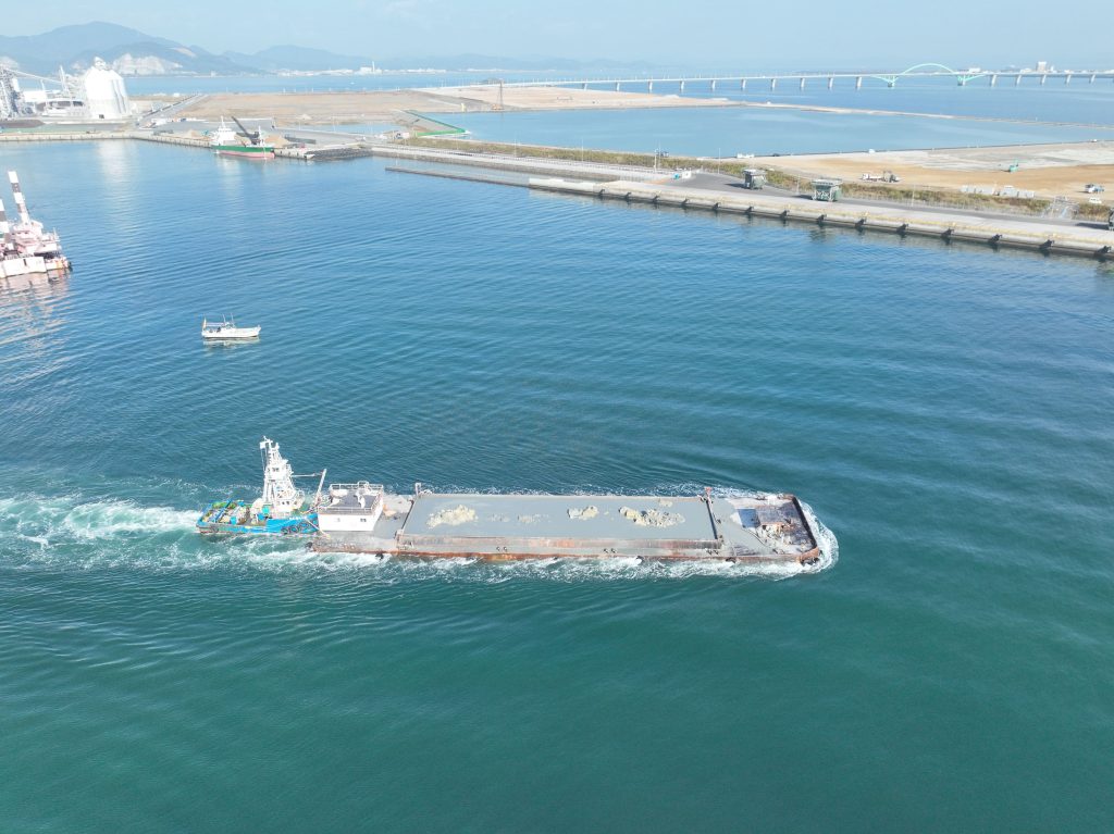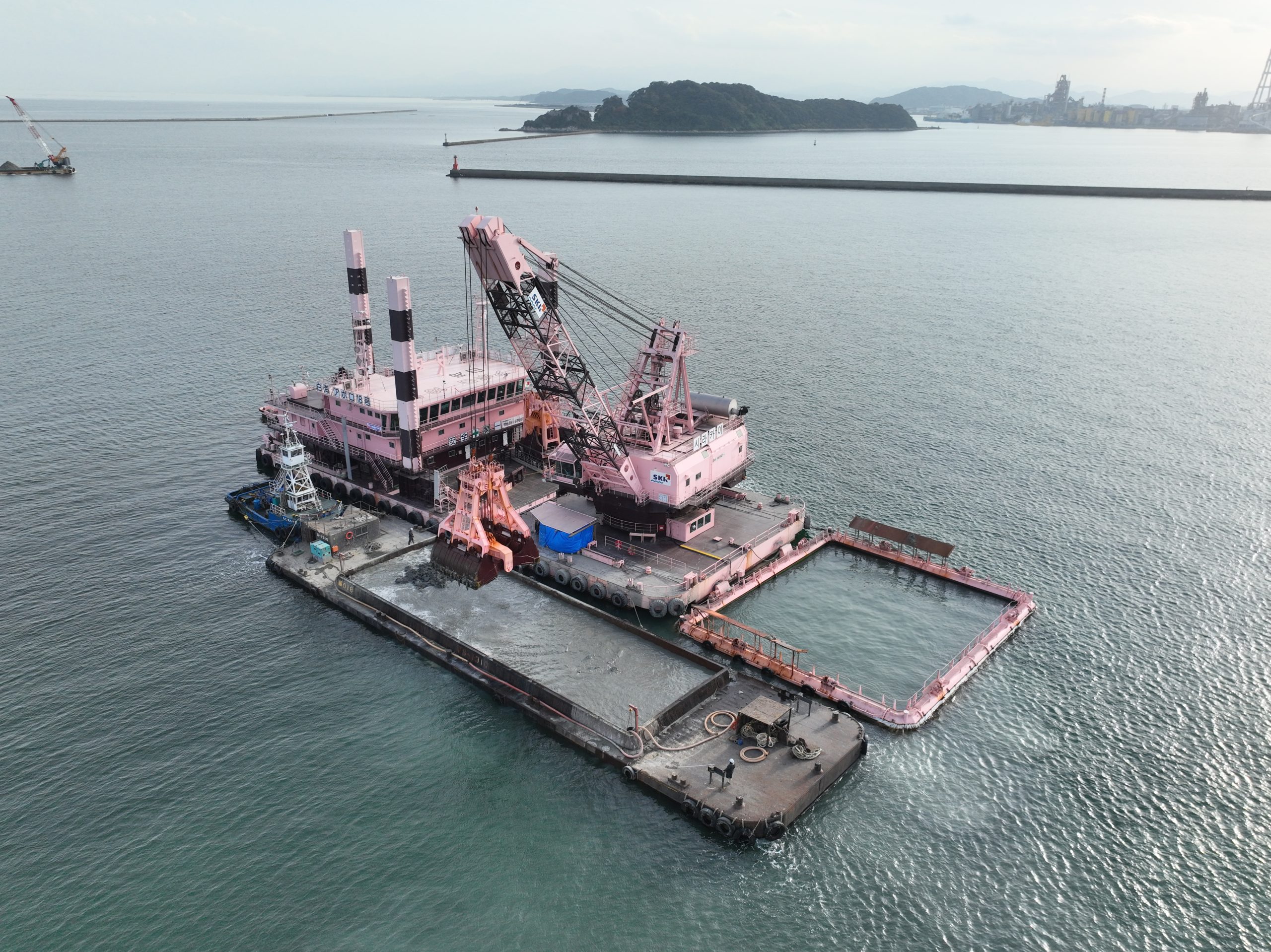 本⼯事は、新松⼭地区泊地において計画⽔深(-10.0m)を確保することを⽬的に浚渫⼯事を実施するものです。