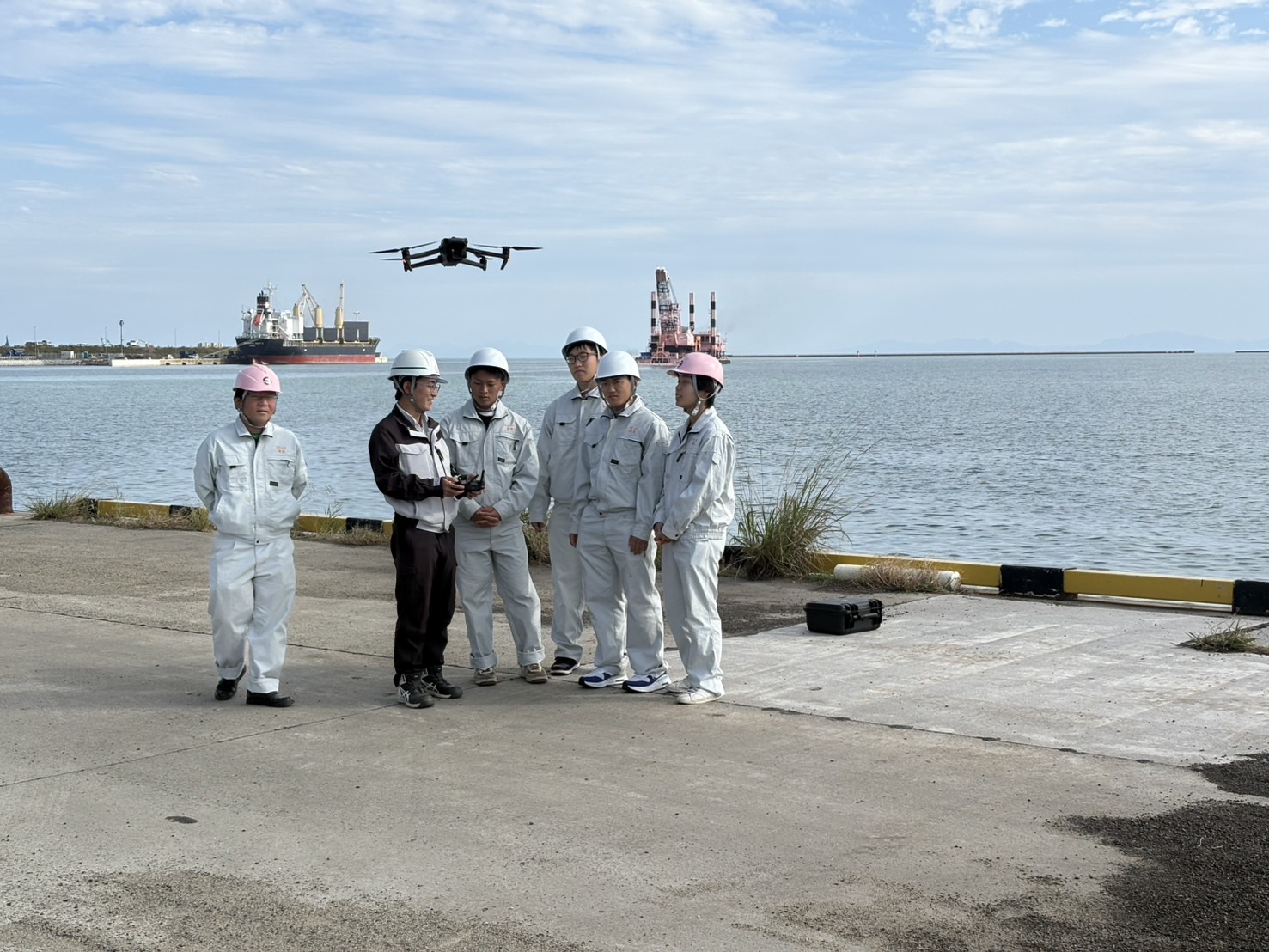 期間中は、現在施工中の7つもの現場を巡り、現場概要説明・見学・ドローン操縦・測量体験学習など多岐にわたる実習を行いました。